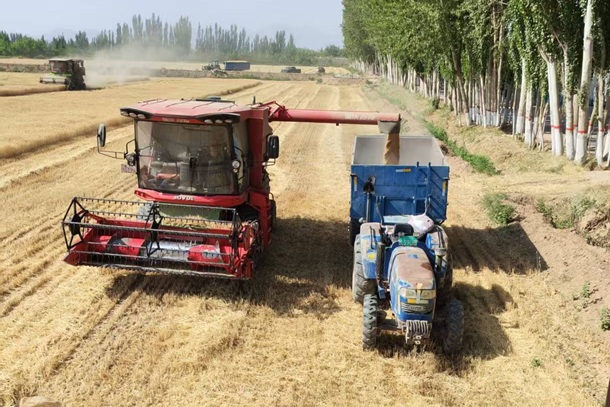 灼人的烈日下,村民艾克拜尔·亚生蹲在地头,眉头拧成了疙瘩。他的20亩麦子熟得正正好,金黄的麦穗仿佛一碰就要掉粒,可一台收割机也排不上号,汗水顺着黝黑的脸颊滑落,砸在干渴的土地上。“往年也赶,但没今年这么急啊……”他的担忧,也是许多清水村人的心声。这时,几个熟悉的身影顶着热浪朝他走来,为首的就是驻村第一书记燕鹏。“艾克拜尔大哥,别着急!收割机马上就到!”燕鹏的声音带着让人安心的肯定。他的身后,工作队员的衬衫早已被汗水浸透,紧贴在身上。