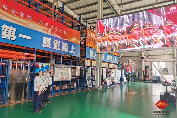 图为胜利能源物资供应中心员工在物资仓库收看庆祝中国共产党成立100周年大会盛况