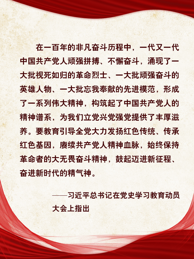 历史,总是在一些特殊年份给人们以汲取智慧、继续前行的力量。在建党一百年这个重要节点,从具有许多新的历史特点的伟大斗争出发,大力发扬红色传统、传承红色基因,赓续共产党人精神血脉,始终保持革命者的大无畏奋斗精神,是牢记初心使命、推进中华民族伟大复兴历史伟业的必然要求,是坚定信仰信念、在新时代坚持和发展中国特色社会主义的必然要求,是推进党的自我革命、永葆党的生机活力的必然要求。要准确把握党的历史发展的主题主线、主流本质,正确认识和科学评价党史上的重大事件、重要会议、重要人物。要旗帜鲜明反对历史虚无主义,加强思想引导和理论辨析,更好正本清源、固本培元。要在全社会广泛开展党史、新中国史、改革开放史、社会主义发展史宣传教育,普及党史知识,推动党史学习教育深入群众、深入基层、深入人心。要鼓励创作党史题材的文艺作品特别是影视作品,抓好青少年学习教育,让红色基因、革命薪火代代传承。